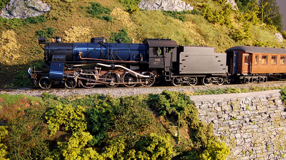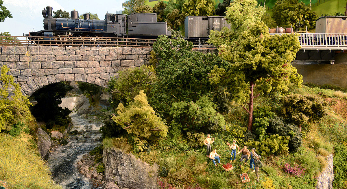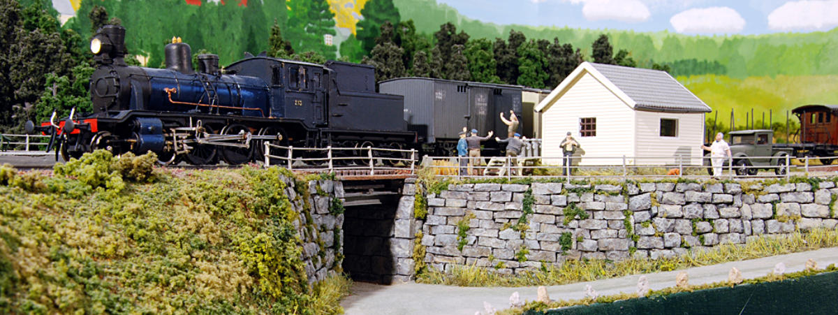 forbildetro hele muren, som er bygd stein for stein etter fotografi. Lokomotivet er av type 24b -- modellen er fra Brimalm, ombygd og